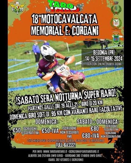 - Sabato 14 settembre, ritrovo in piazza de Gasperi a Bedonia ore 18.00, partenza moto dalle 19.00, tracciato di 20/25km di SOLO HARD ENDURO (con il famoso HARD DE "LA FIGHETTA" illuminata).